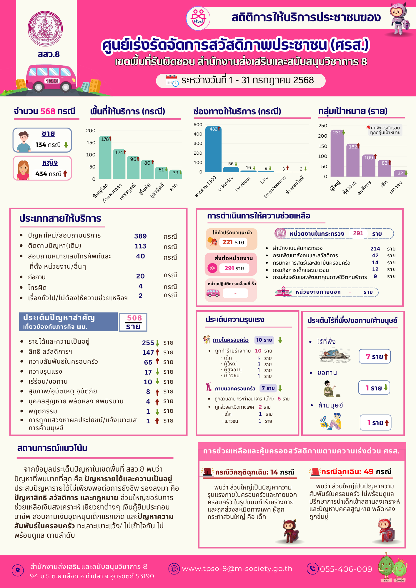 สถิติการให้บริการของประชาชนของศูนย์เร่งรัดจัดการสวัสดิภาพประชาชน(ศรส.) เขตพื้นที่รับผิดชอบ สำนักงานส่งเสริมและสนับสนุนวิชาการ 8 ประจำเดือนกรกฎาคม 2568