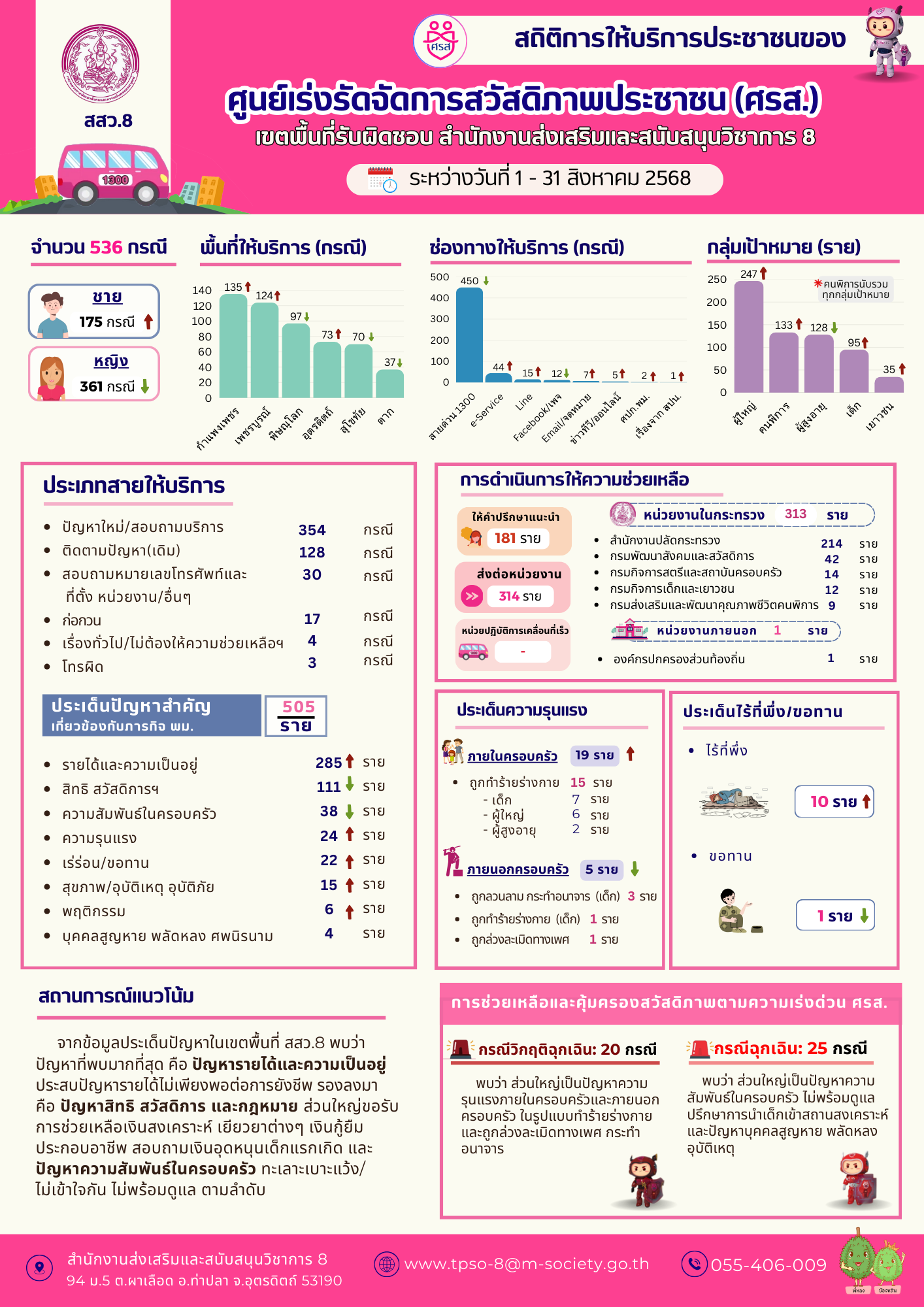 สถิติการให้บริการของประชาชนของศูนย์เร่งรัดจัดการสวัสดิภาพประชาชน(ศรส.) เขตพื้นที่รับผิดชอบ สำนักงานส่งเสริมและสนับสนุนวิชาการ 8 ประจำเดือนสิงหาคม 2568