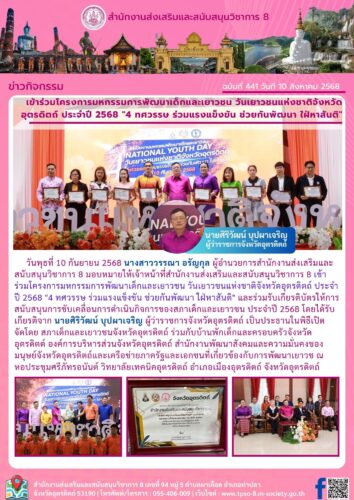 วันพุธที่ 10 กันยายน 2568 นางสาววรรณา อรัญกุล ผู้อำนวยการสำนักงานส่งเสริมและสนับสนุนวิชาการ 8 มอบหมายให้เจ้าหน้าที่สำนักงานส่งเสริมและสนับสนุนวิชาการ 8 เข้าร่วมโครงการมหกรรมการพัฒนาเด็กและเยาวชน วันเยาวชนแห่งชาติจังหวัดอุตรดิตถ์ ประจำปี 2568 “4 ทศวรรษ ร่วมแรงแข็งขัน ช่วยกันพัฒนา ใฝ่หาสันติ” และร่วมรับเกียรติบัตรให้การสนับสนุนการขับเคลื่อนการดำเนินกิจการของสภาเด็กและเยาวชน ประจำปี 2568 โดยได้รับเกียรติจาก นายศิริวัฒน์ บุปผาเจริญ ผู้ว่าราชการจังหวัดอุตรดิตถ์ เป็นประธานในพิธีเปิด จัดโดย สภาเด็กและเยาวชนจังหวัดอุตรดิตถ์ ร่วมกับบ้านพักเด็กและครอบครัวจังหวัดอุตรดิตต์ องค์การบริหารส่วนจังหวัดอุตรดิตถ์ สำนักงานพัฒนาสังคมและความมั่นคงของมนุษย์จังหวัดอุตรดิตถ์และเครือข่ายภาครัฐและเอกชนที่เกี่ยวข้องกับการพัฒนาเยาวช ณ หอประชุมศรีภัทรอนันต์ วิทยาลัยเทคนิคอุตรดิตถ์ อำเภอเมืองอุตรดิตถ์ จังหวัดอุตรดิตถ์
